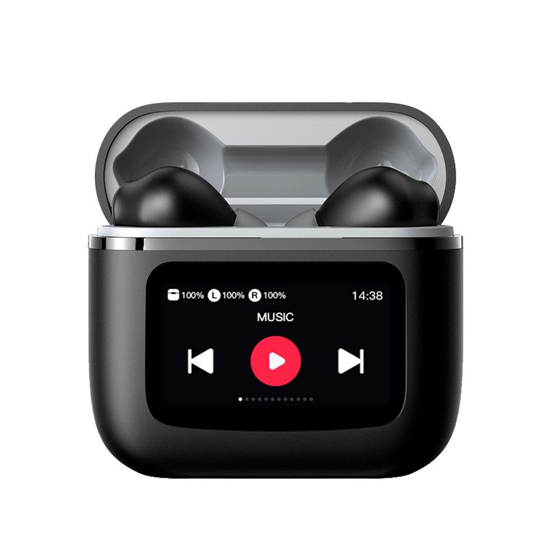 Auriculares estéreo Bluetooth para escuchar música y hablar por teléfono gracias a su conexión bluetooth. Novedoso diseño con pantalla táctil multifunción intengrada en la caja cargadora.